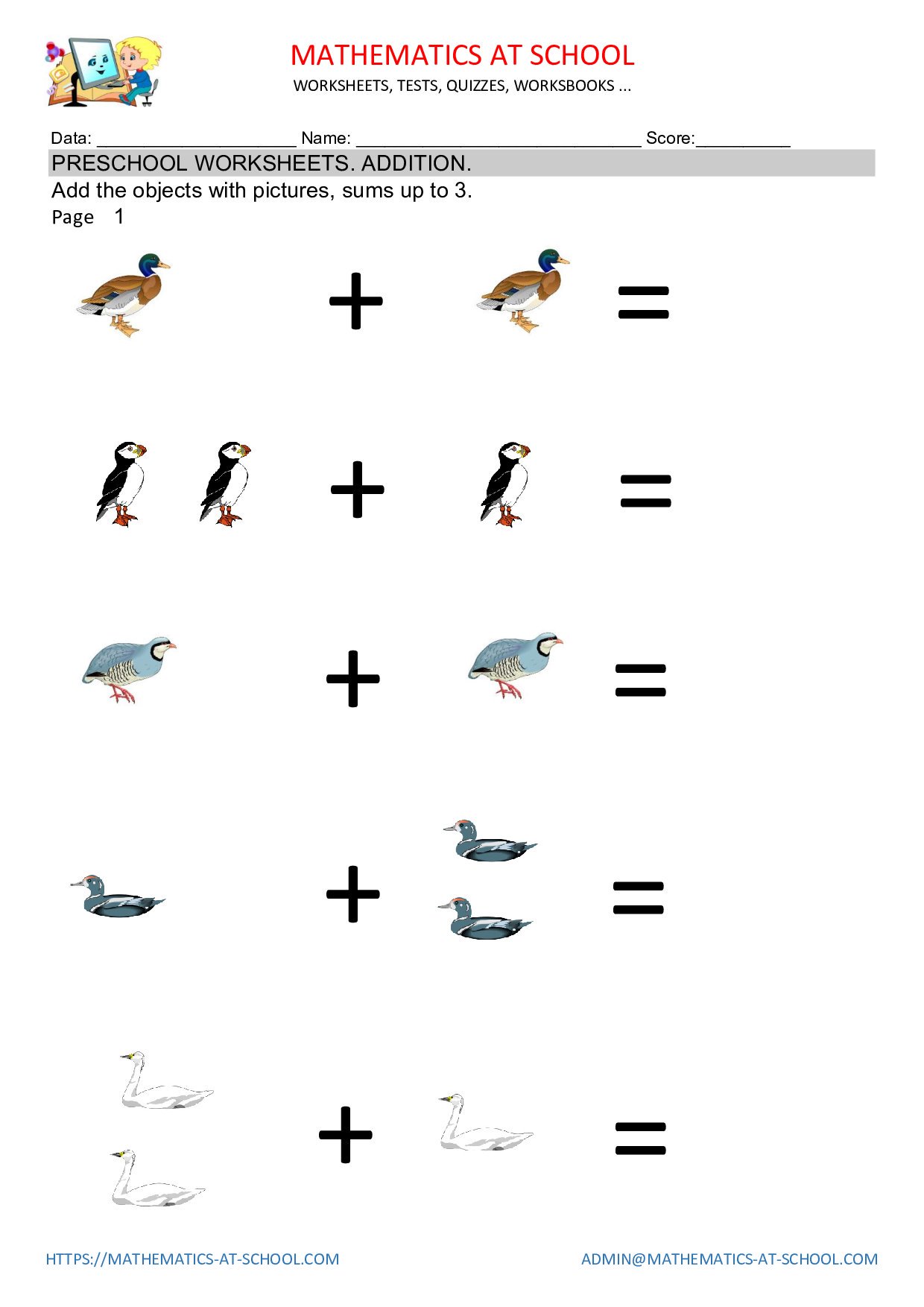 Animal Math Worksheets (1-10) - Simple Fun for Kids These math worksheets are perfect for those kids who are learning to count with easy addition and subtraction questions for your little ones. These were created with a fun animal theme with 8 pages of cuteness. There are 2 pages of counting, 2 pages of addition, 2 pages of subtraction and 2 patterning pages.